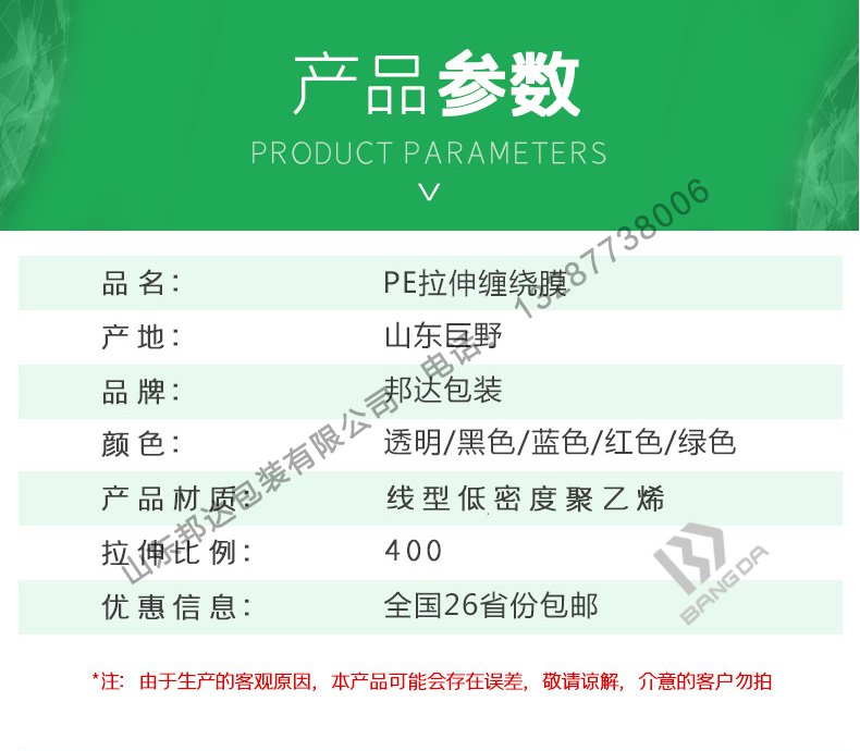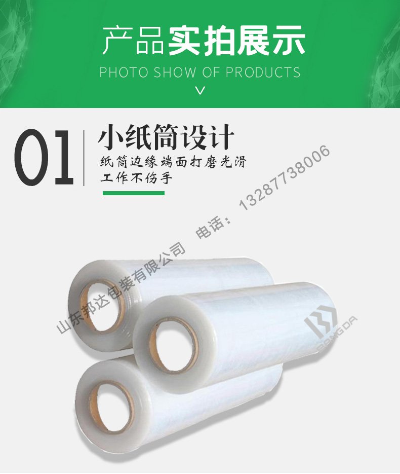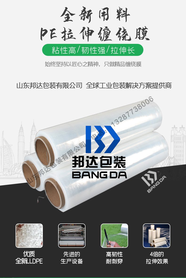 山東邦達包裝有限公司公司講誠信重信譽,注重手用纏繞膜產品質量,匠心精神,精益求精,完善的售后服務體系,我們是山東濟南纏繞膜廠家是生產預拉伸纏繞膜、PE纏繞膜纏繞膜拉伸膜的廠