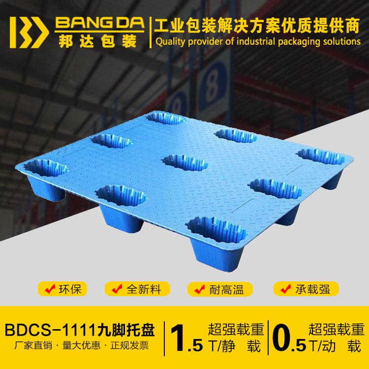九腳塑料托盤,即根據托盤的外形來看,這種類型的托盤底部是九腳,因此得名九腳塑料托盤。一般這種裝載比較輕,不適合上架裝載貨物,也不適合轉運重物。九腿托盤一般用作倉庫的輕貨墊板,叉車用于翻輕貨。這樣的盤面形狀有:平面和網格之分。
