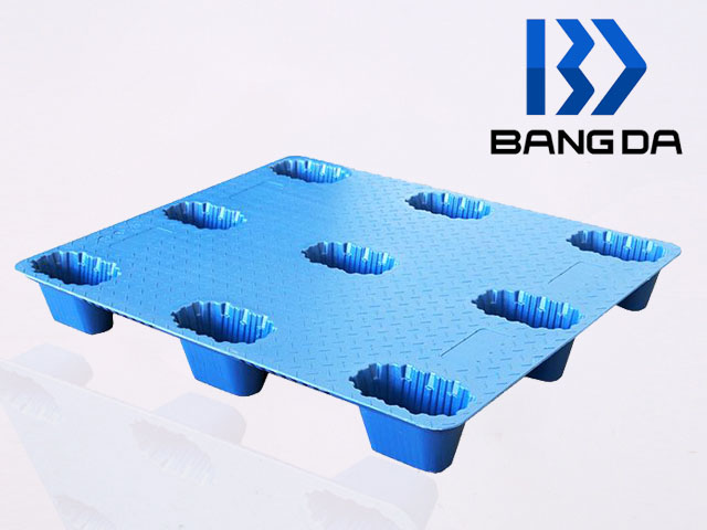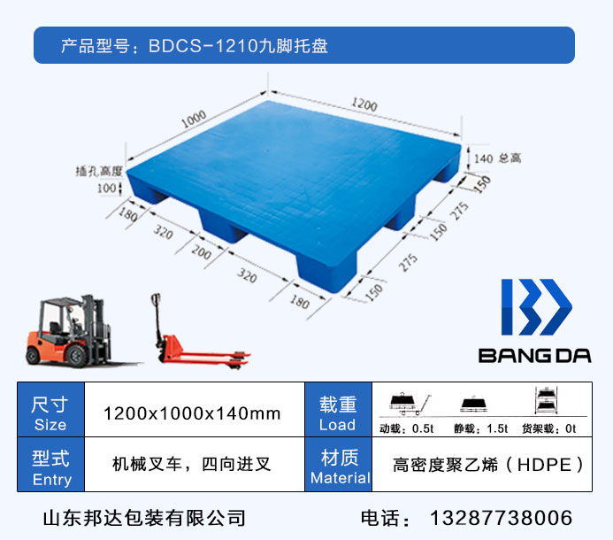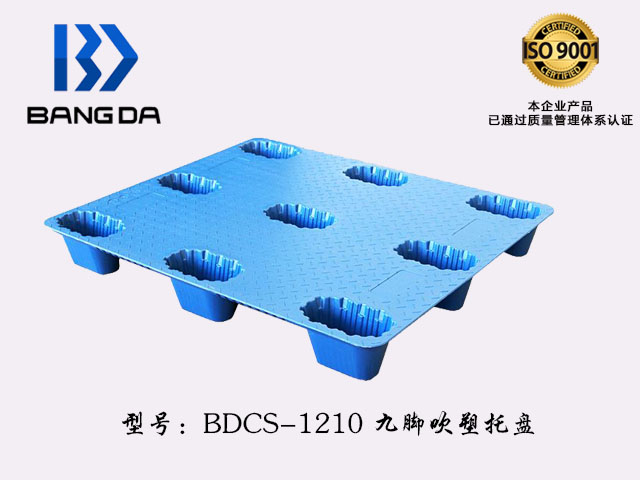 九腳塑料托盤,即根據托盤的外形來看,這種類型的托盤底部是九腳,因此得名九腳塑料托盤。一般這種裝載比較輕,不適合上架裝載貨物,也不適合轉運重物。九腿托盤一般用作倉庫的輕貨墊板,叉車用于翻輕貨。這樣的盤面形狀有:平面和網格之分。