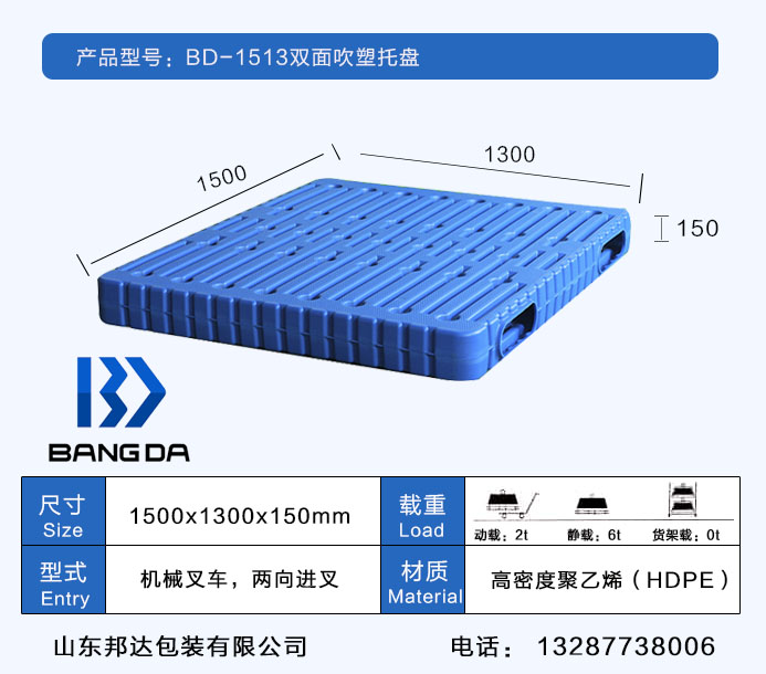 BD-1513雙面塑料托盤尺寸為1500*1300*150(mm)采用國內最先進的吹塑技術,原材料采用的是HDPE一種結晶度高,非極性的熱塑性樹脂;邦達的雙面塑料托盤承載強,耐高溫且環保;山東邦達包裝有