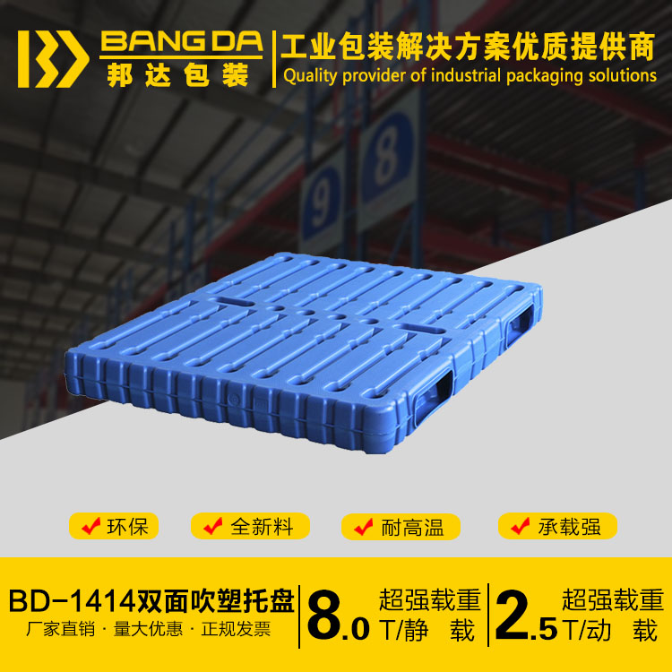 BD-1414雙面塑料托盤尺寸為1400*1400*150(mm),采用國內最先進的吹塑技術,原材料采用的是HDPE一種結晶度高,非極性的熱塑性樹脂;邦達的雙面塑料托盤承載強,耐高溫且環保;山東邦達包裝有限公司承諾旗下所有的產品均此采用全新材料,廠家直銷,正規發票,量大優惠!