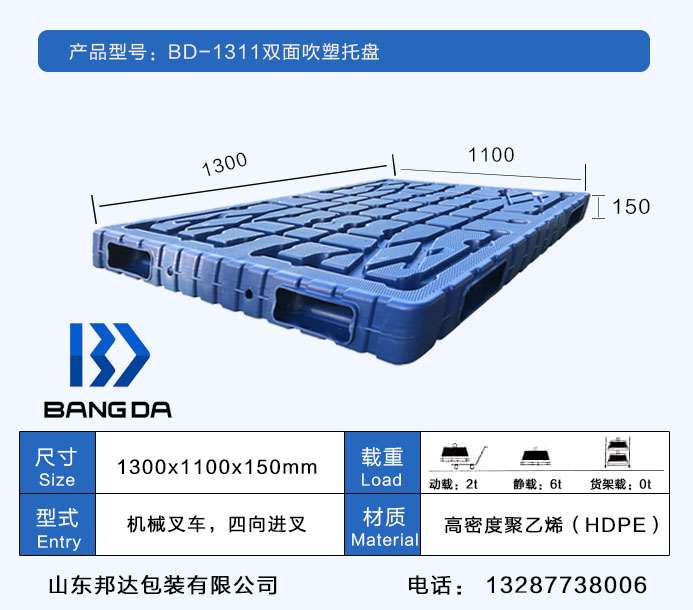 BD-1311雙面塑料托盤尺寸為1300*1100*150(mm),采用國內最先進的吹塑技術,原材料采用的是HDPE一種結晶度高,非極性的熱塑性樹脂;邦達的雙面塑料托盤承載強,耐高溫且環保;山東邦達包裝有限公司承諾旗下所有的產品均此采用全新材料,廠家直銷,正規發票,量大優惠!