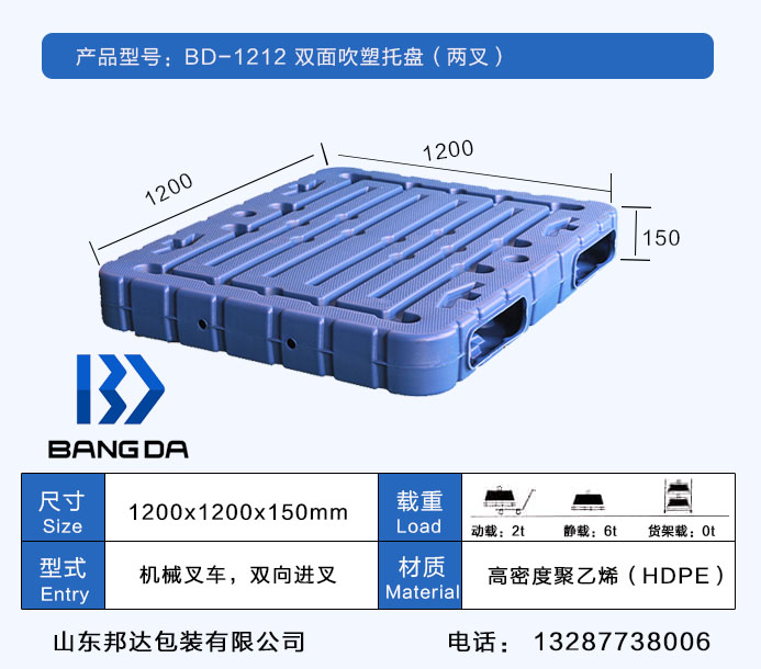 BD-1212雙面塑料吹塑托盤尺寸為1200*1200*150(mm),采用國內最先進的吹塑技術,原材料采用的是HDPE一種結晶度高,非極性的熱塑性樹脂;邦達的雙面塑料托盤承載強,耐高溫且環保;山東邦達包裝有限公司承諾旗下所有的產品均此采用全新材料,廠家直銷,正規發票,量大優惠!